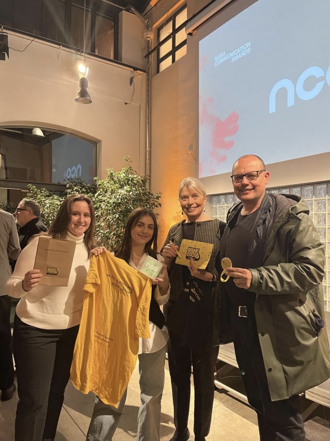 Il progetto “L’amico Frank & il drunk Friend Rescue Kit”, campagna di comunicazione vincitrice del concorso, ideato da Rebecca Geri – Art Director, Camilla Pietrosanto – Copywriter ha ricevuto il premio d’oro per la categoria Advertising. Le vincitrici sono state premiate da Dionigi Mattia Gagliardi (Course Leader Triennio in Graphic Design and Art Direction Roma). Il loro progetto di comunicazione è stato coordinato da Assunta Squitieri e Alessio Natale Ferri (docenti NABA).